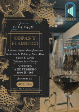 Copas y Flamenco A Tu Aire, celebra con nosotros el Día de San Valentín con una pequeña Cata de Vino + Show Flamenco con buenos artistas, en un espacio único e íntimo como Vinauro. El próximo viernes 14 de febrero 20:00 hrs. en Calle Cárcel Alta, 7, Albaicín, Granada.