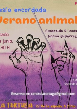 A raíz del poemario Verano animal (Editorial Tremendes, 2024), de Esmeralda R. Vaquero, la violinista Marina Gutiérrez y la poeta crean una propuesta escénica donde combinan poesía, música y atmósfera. Los versos del poemario transitan algunas experiencias presentes en la sociedad y el sufrimiento derivado de ellas, tratando de reflejarlas en este espectáculo de forma poética y sonora, con un lenguaje expresivo y voraz.