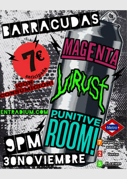 Prepárate porque la Barracudas va a temblar el 30 de noviembre. Vuelven los bolos que huelen a sudor, ruido y energía pura. Magenta llegan con toda su potencia, Virus T regresan para destrozar el escenario como solo ellos saben, y Punitive Room van a rematar la noche como una descarga que no te deja respirar.